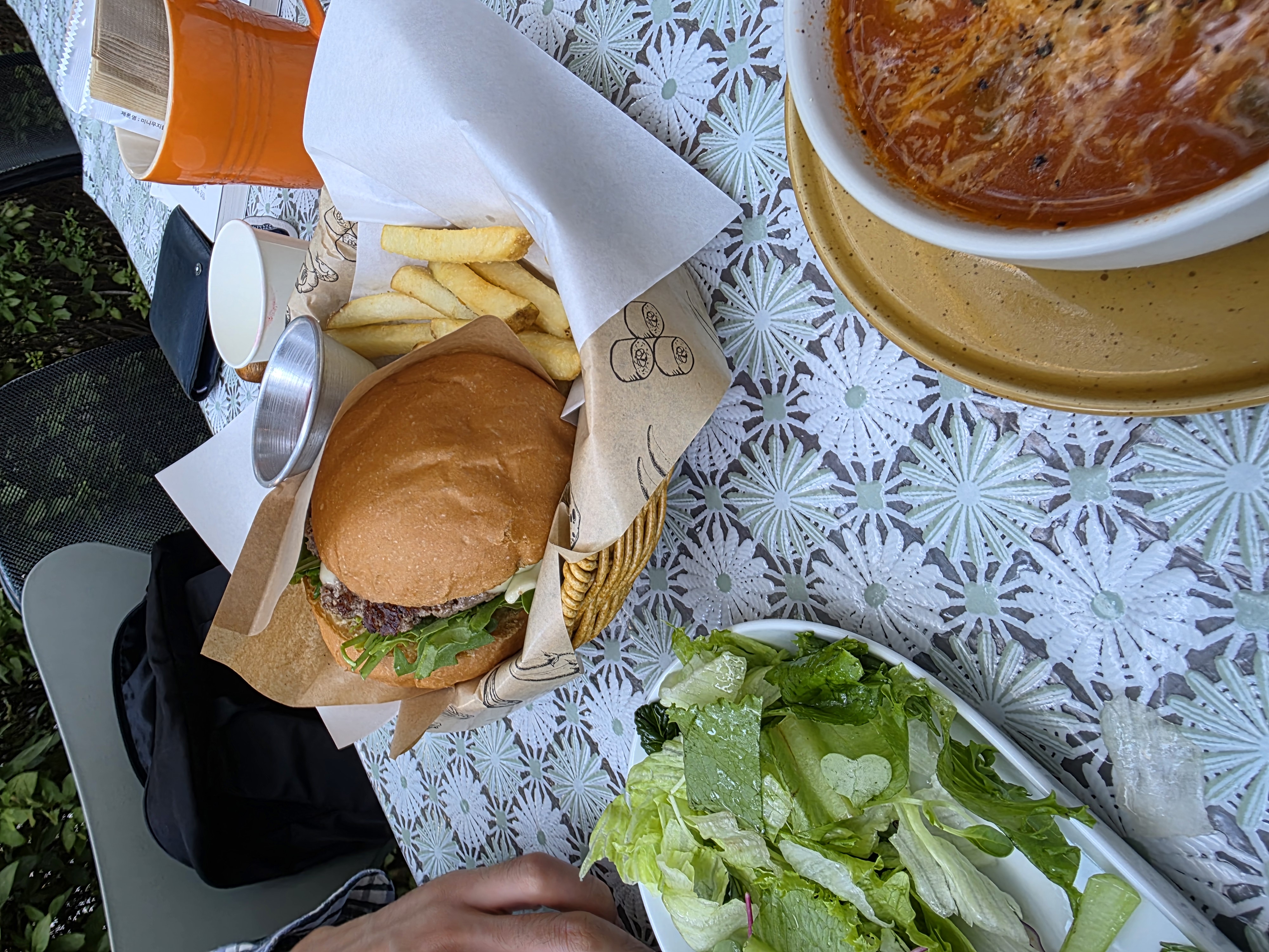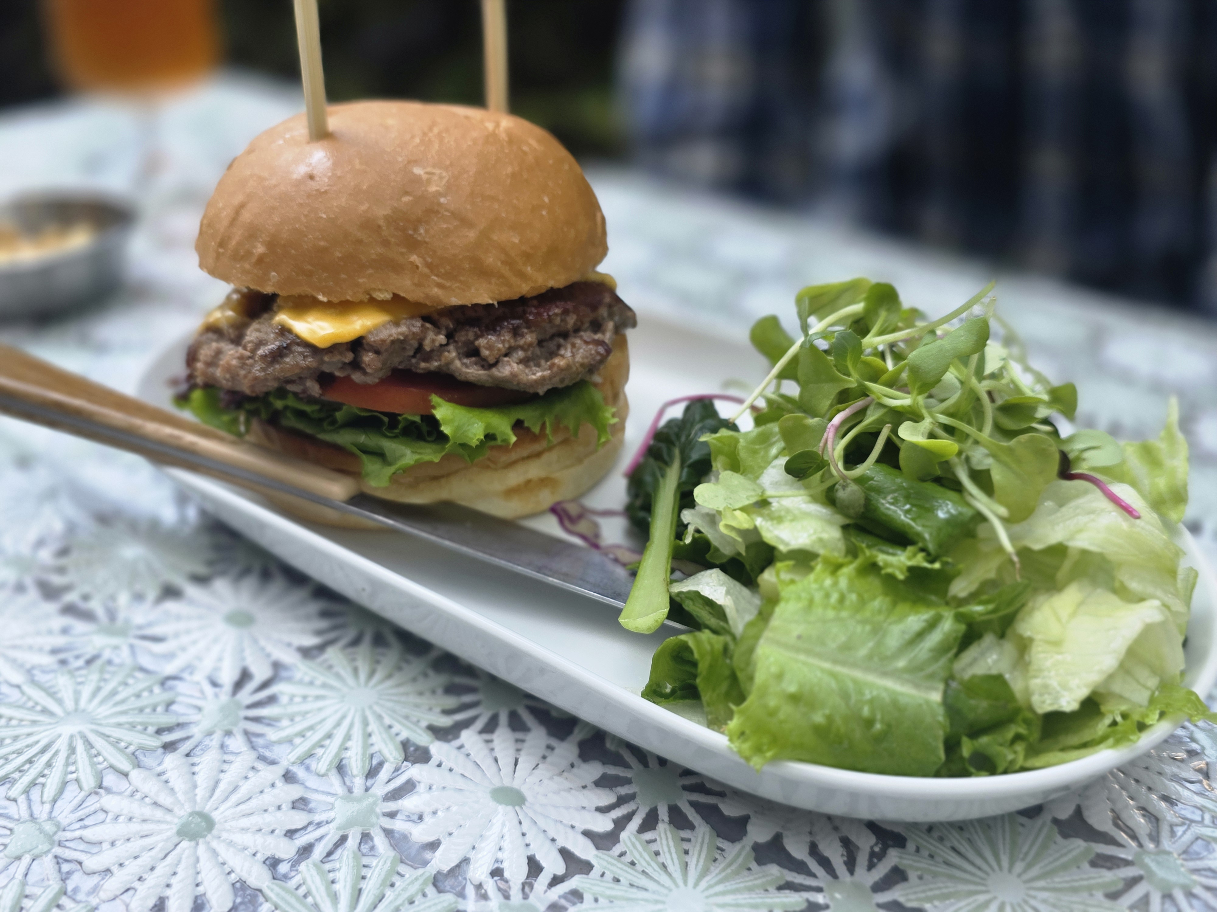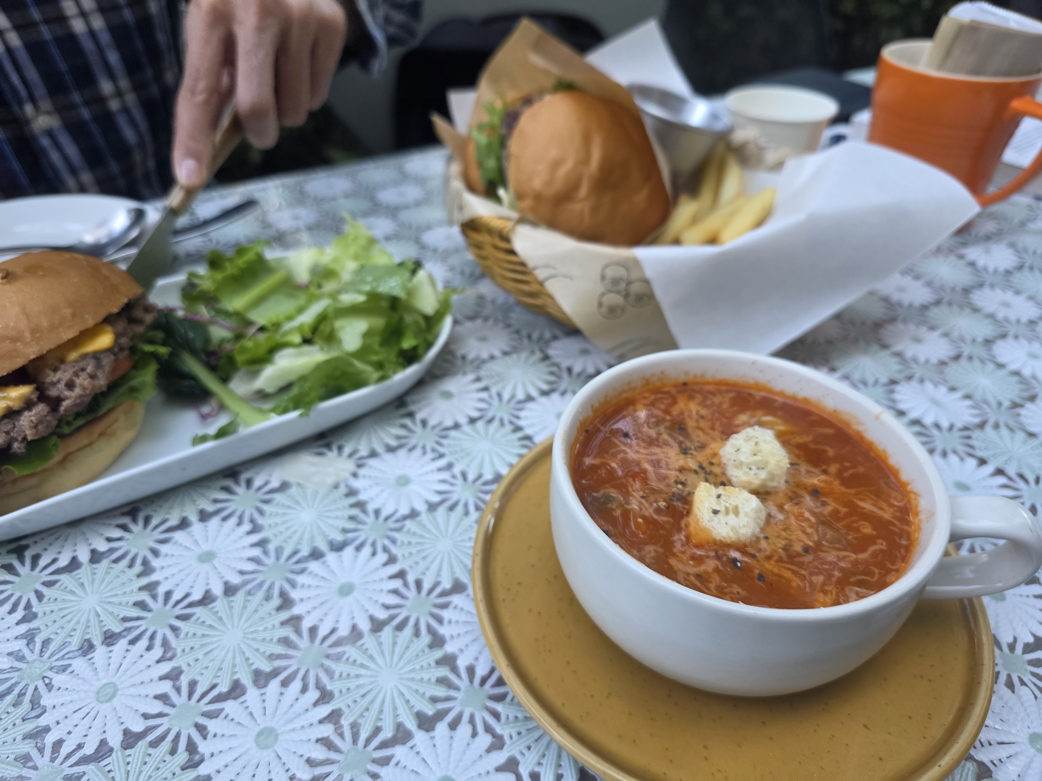 외부 좌석은 마치 작은 정원처럼 꾸며져 있어 푸른 나무를 바라보며 식사를 즐길 수 있습니다. 아름다운 경치에 어우러져 먹는 햄버거는 그 맛이 배가 되는 듯했습니다. 눈과 입이 모두 즐거운 경험을 선사하는 곳이죠. 특히 해가 질 무렵 야외에 앉으면 고즈넉한 풍경 속에서 이국적인 수제 버거를 먹는 묘한 조화가 매력적입니다.