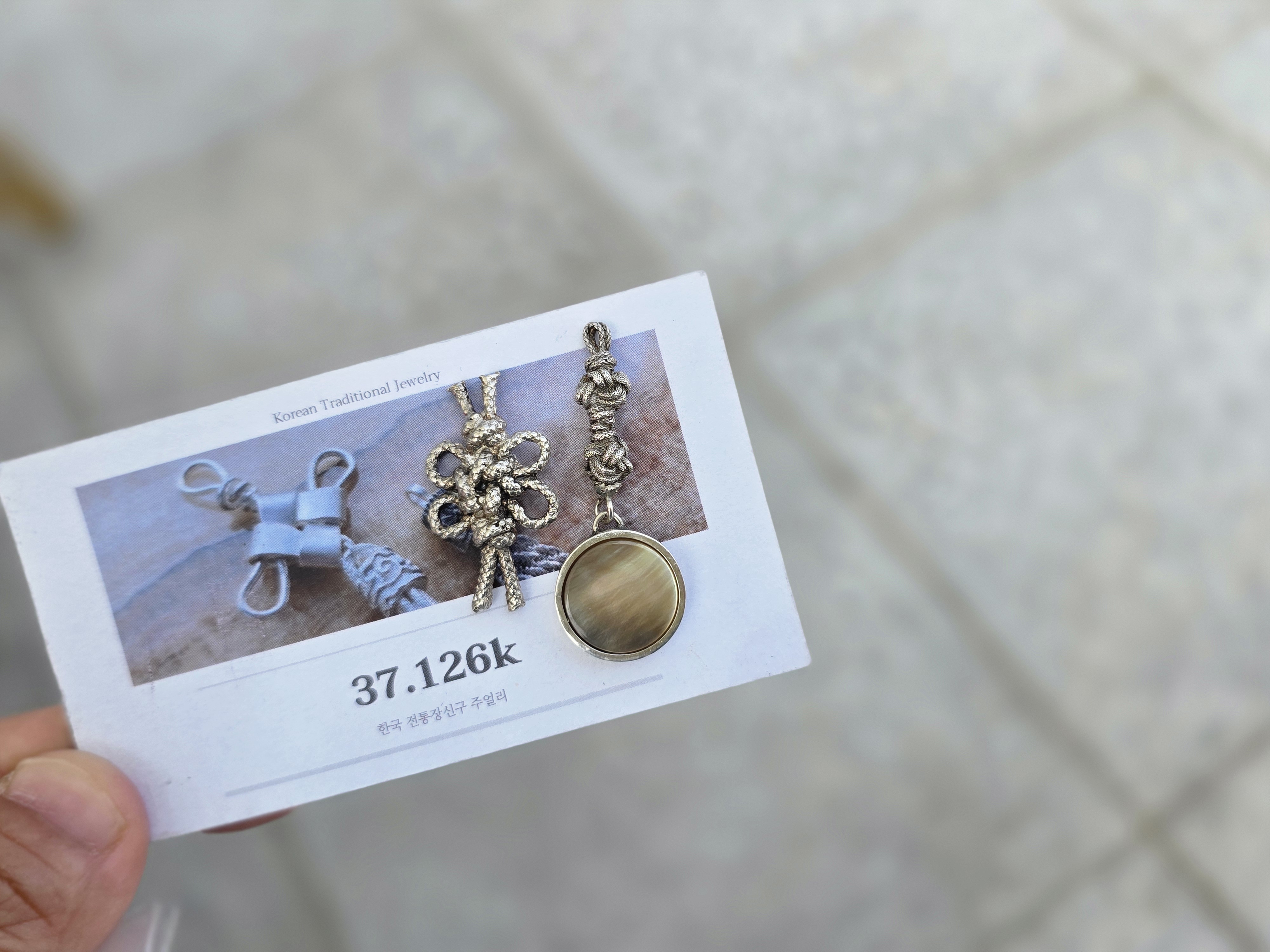 아트인파츠는 체험뿐만 아니라 다양하고 독창적인 수공예품 판매도 중심이었죠. 여러 부스를 구경하는 내내 눈을 뗄 수 없는 작품들이 가득했습니다. 그중에서도 제 마음을 단번에 사로잡은 작품이 있었는데, 바로 은 세공품으로 전통매듭의 아름다움을 구현한 액세서리였습니다.