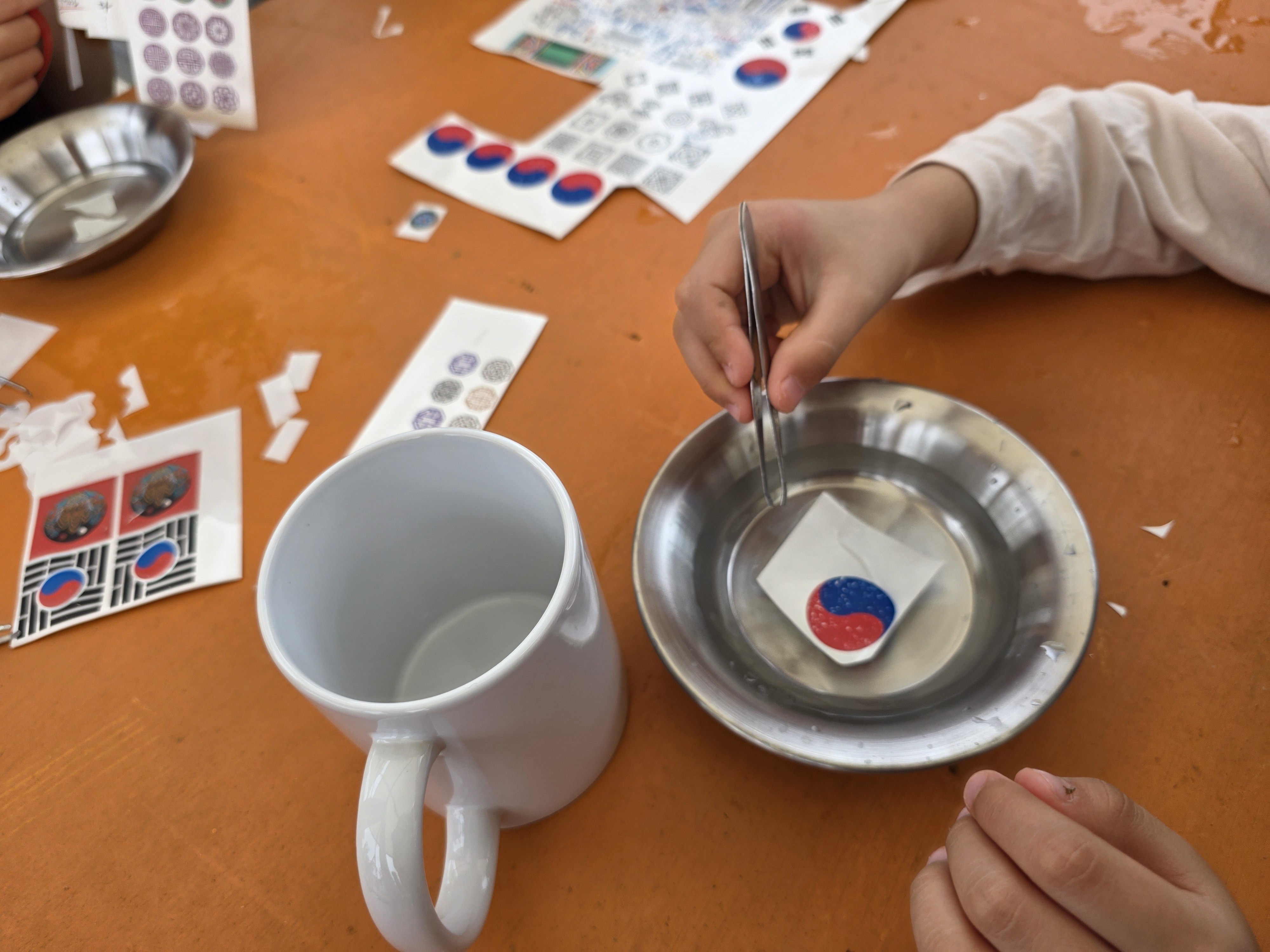 머그컵 전사지 체험은 정말 쉽고 간단했어요. 어린 아이도 충분히 참여해서 자신만의 컵을 만들 수 있을 정도로 난이도가 낮았죠. 얇은 전통 문양 전사지를 컵에 원하는 대로 배치하고 물을 묻혀 살살 눌러주면 끝이었답니다. 이렇게 완성된 머그컵은 현장에서 바로 가져갈 수는 없었고, **소성(굽는 과정)**을 거친 후 택배로 보내준다고 하셨어요. 더 놀라웠던 건, 이 모든 체험의 참여비가 무료였다는 점입니다. 완성된 작품을 집에서 받아볼 생각에 가족 모두 설렘을 감추지 못했죠.