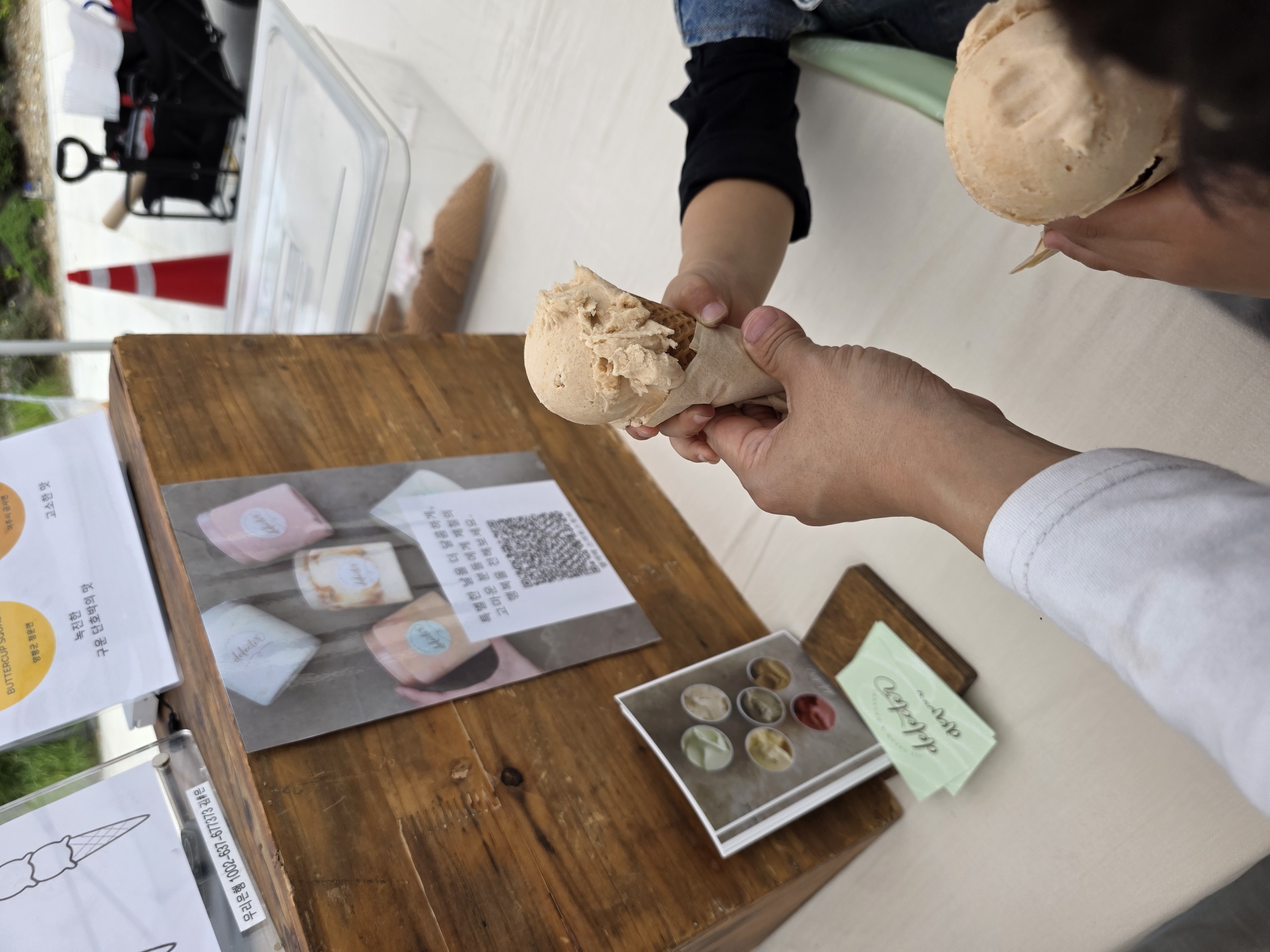 공예 체험을 마친 후, 잠시 행사장 주변을 구경하다가 출출함을 달랠 겸 특별한 아이스크림을 먹었어요. 판매 부스에서 직접 만들었다는 수제 아이스크림이었는데, 총 네 가지 맛 중에서 고를 수 있었습니다. 콘에 한 가지 맛을 담아 먹었는데, 가격은 5,000원이었지만, 수제로 만든 특유의 신선하고 깊은 맛이 일품이었답니다.