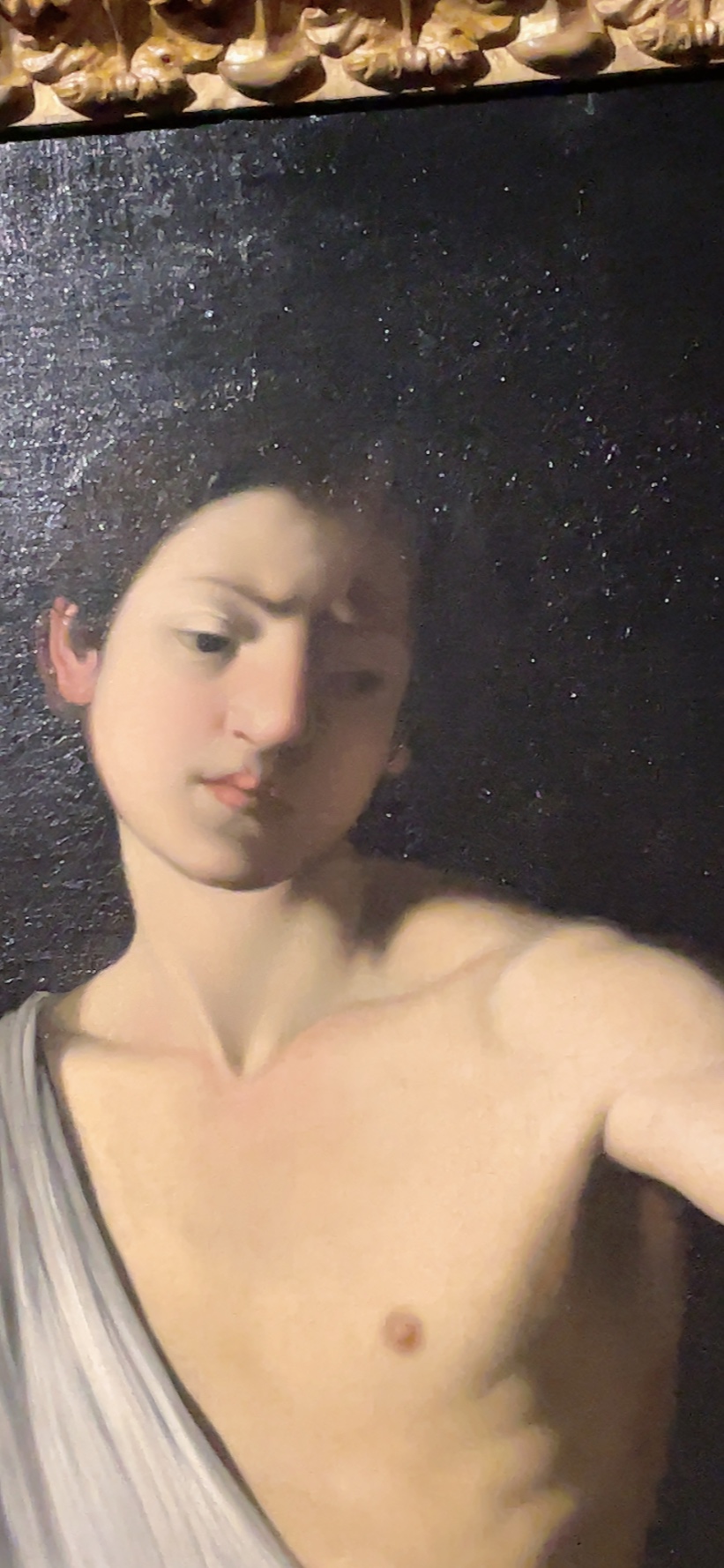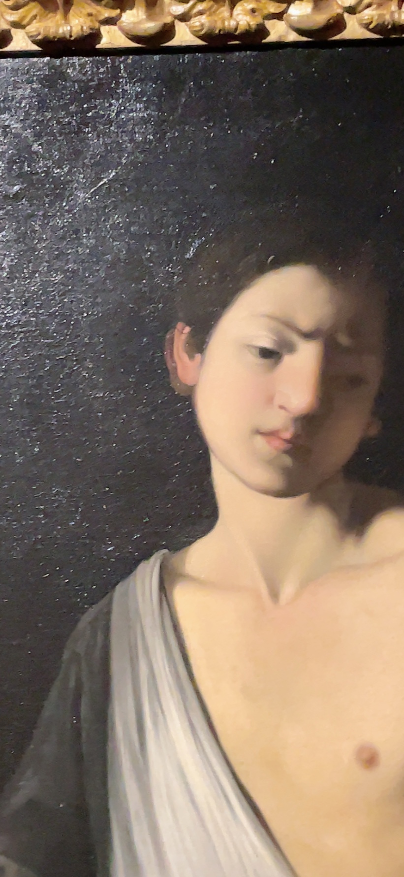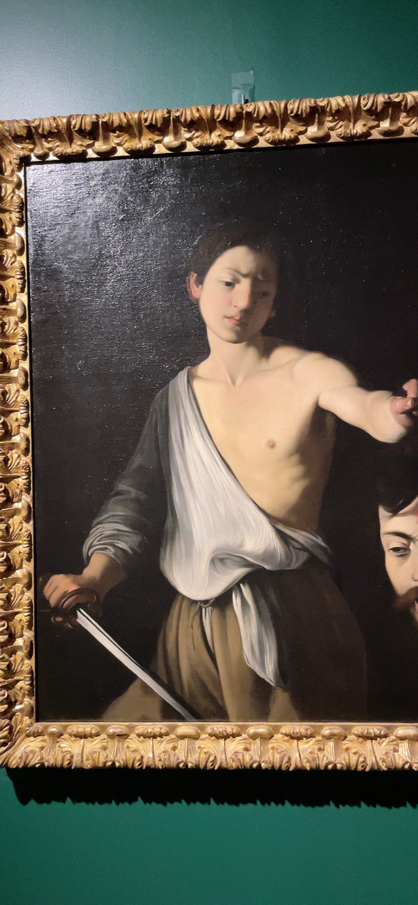 또 다른 인상적인 작품인 **<골리앗의 머리를 든 다윗>**에 대한 관람객님의 세밀한 관찰력은 매우 탁월합니다. 다윗의 귀 부분에서 발견하신 수정의 흔적(Pentimento), 즉 '귀 크기가 맞지 않아 수정한 듯한 이중의 선'은 카라바조가 완벽한 밑그림 없이 캔버스에 직접 그림을 그리는 '알라 프리마(alla prima)' 방식을 선호했음을 보여주는 흥미로운 증거입니다.