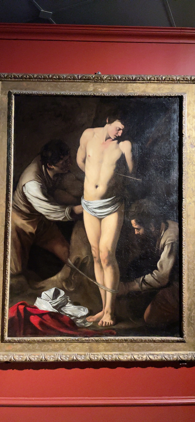 관람객님께서 특히 **<성 세바스찬>**에서 인상적이었다고 언급하신 점은 카라바조 예술의 핵심을 꿰뚫고 있습니다. 순교자 성 세바스찬은 전통적으로 숭고하고 이상화된 '성인'의 모습으로 그려지는 경우가 많았지만, 카라바조는 그 인물을 지극히 인간적인 고통과 사실적인 육체를 가진 존재로 묘사합니다.