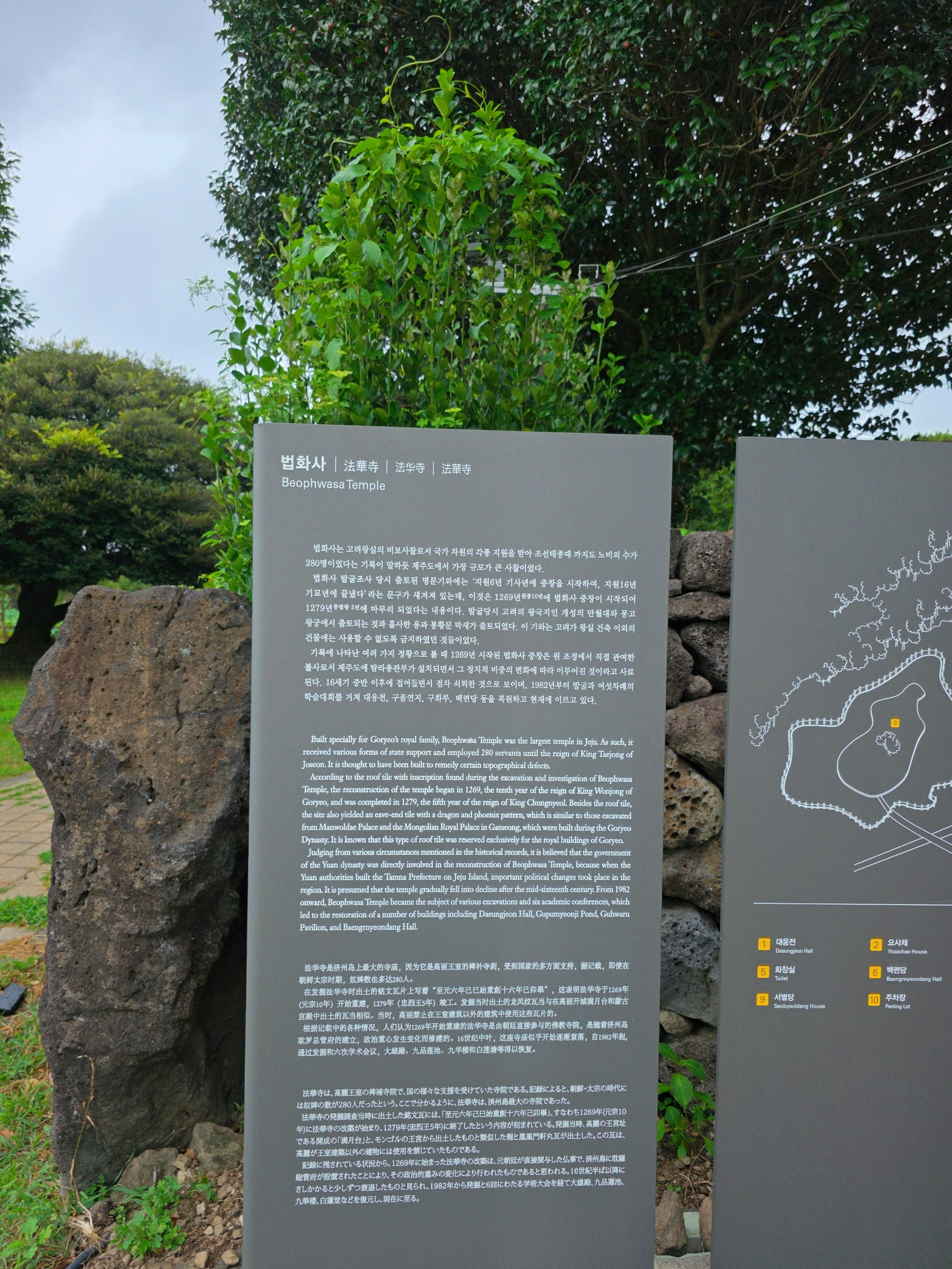 법화사는 통일신라시대 해상왕 장보고가 창건한 것으로 추정되는 천년고찰로, 고려 시대에는 제주도 최대의 가람으로 번성했던 역사적 의미가 깊은 곳입니다. 제주도 기념물 제13호인 **법화사지(法華寺址)**가 남아있어, 옛터의 초석과 기와 조각들이 과거의 번성했던 역사를 묵묵히 증언하고 있습니다. 법화사는 이러한 오랜 역사에도 불구하고 현대적인 상업 시설이 추가되지 않아 태고적 사찰의 모습을 고스란히 간직하고 있다는 점이 매우 인상적이었습니다. 마치 시간의 흐름 속에서도 변치 않는 정갈함과 고고함을 지켜온 듯합니다.