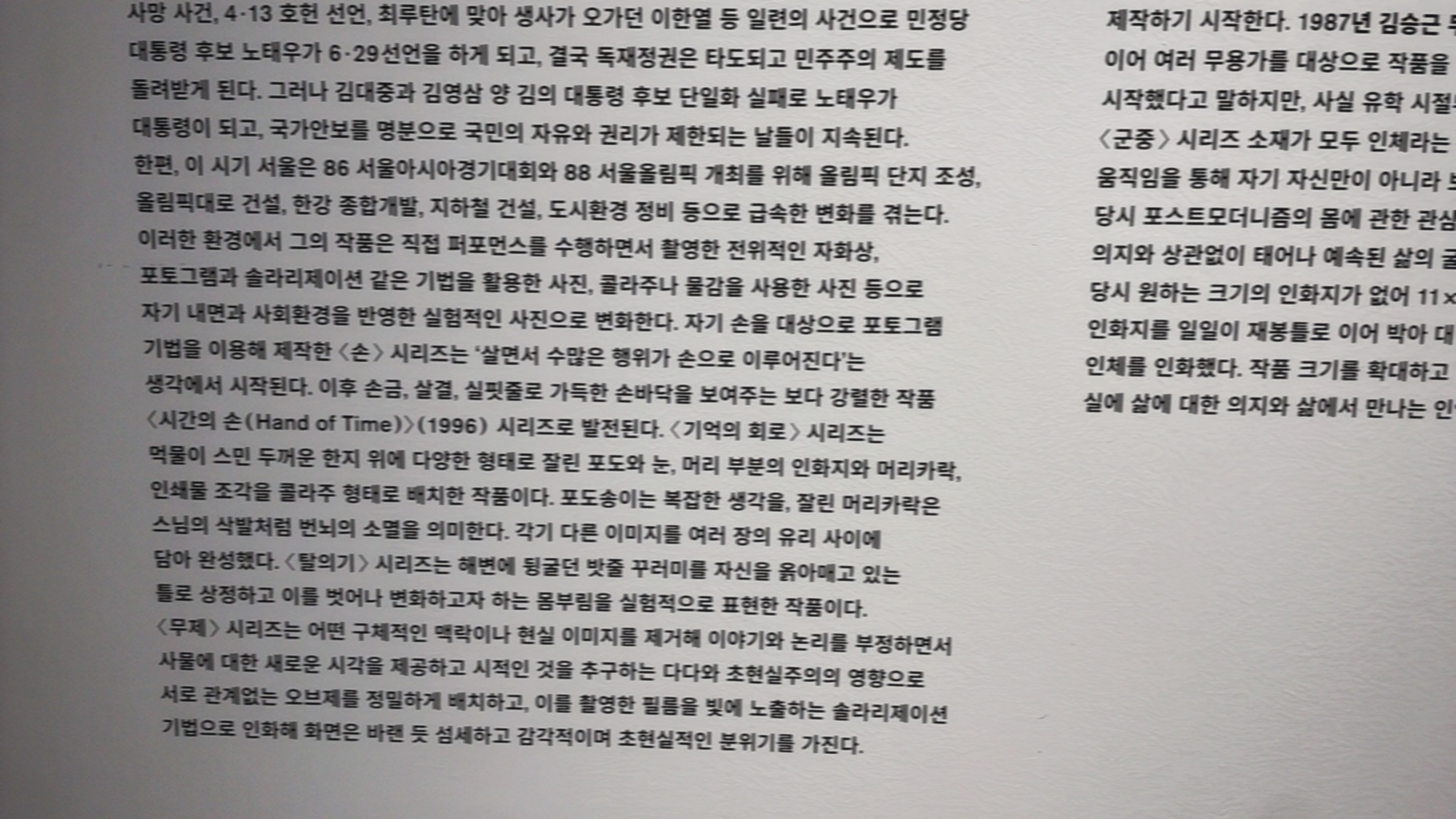 사실 그는 처음부터 사진작가는 아니었습니다. 연세대학교에서 경영학을 전공한 후 무역회사인 대우실업에 근무했던 평범한 직장인이었습니다. 출퇴근을 반복하던 일상에서 평생 이렇게 살 수는 없다는 생각에 독일로 떠났습니다. 이는 제2외국어로 독일어를 배웠던 배경 때문이었다고 전해졌습니다. 독일 주재원으로 다시 회사 생활을 하던 중, 함부르크에서 만난 시각적인 거리에 매료되었습니다. 결국 1980년 함부르크 조형미술대학에 입학하여 사진 디자인을 전공했습니다. 결과가 빨리 나오는 사진의 매력에 빠졌다고 합니다. 이 유학 시절에 제작된 초기 유럽(1979년~1985년) 도시 풍경 사진들이 세상에 나왔습니다.