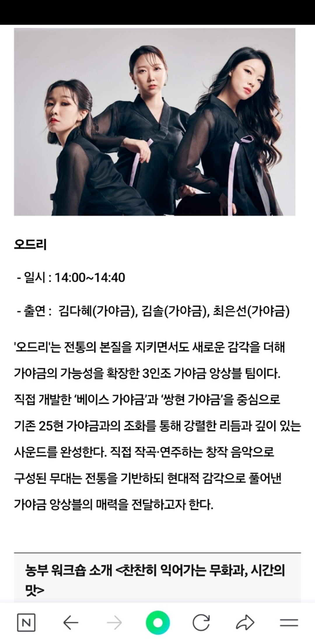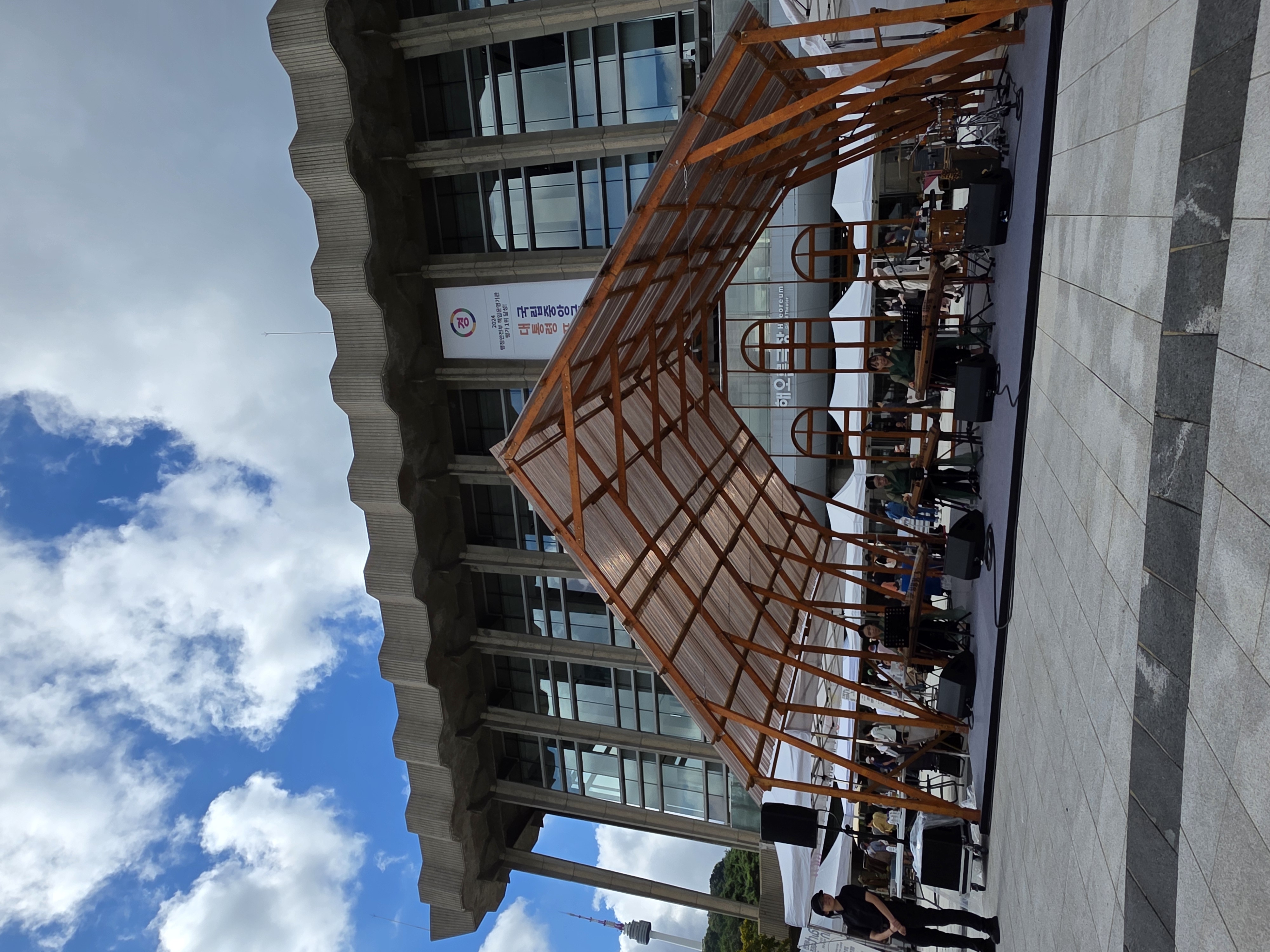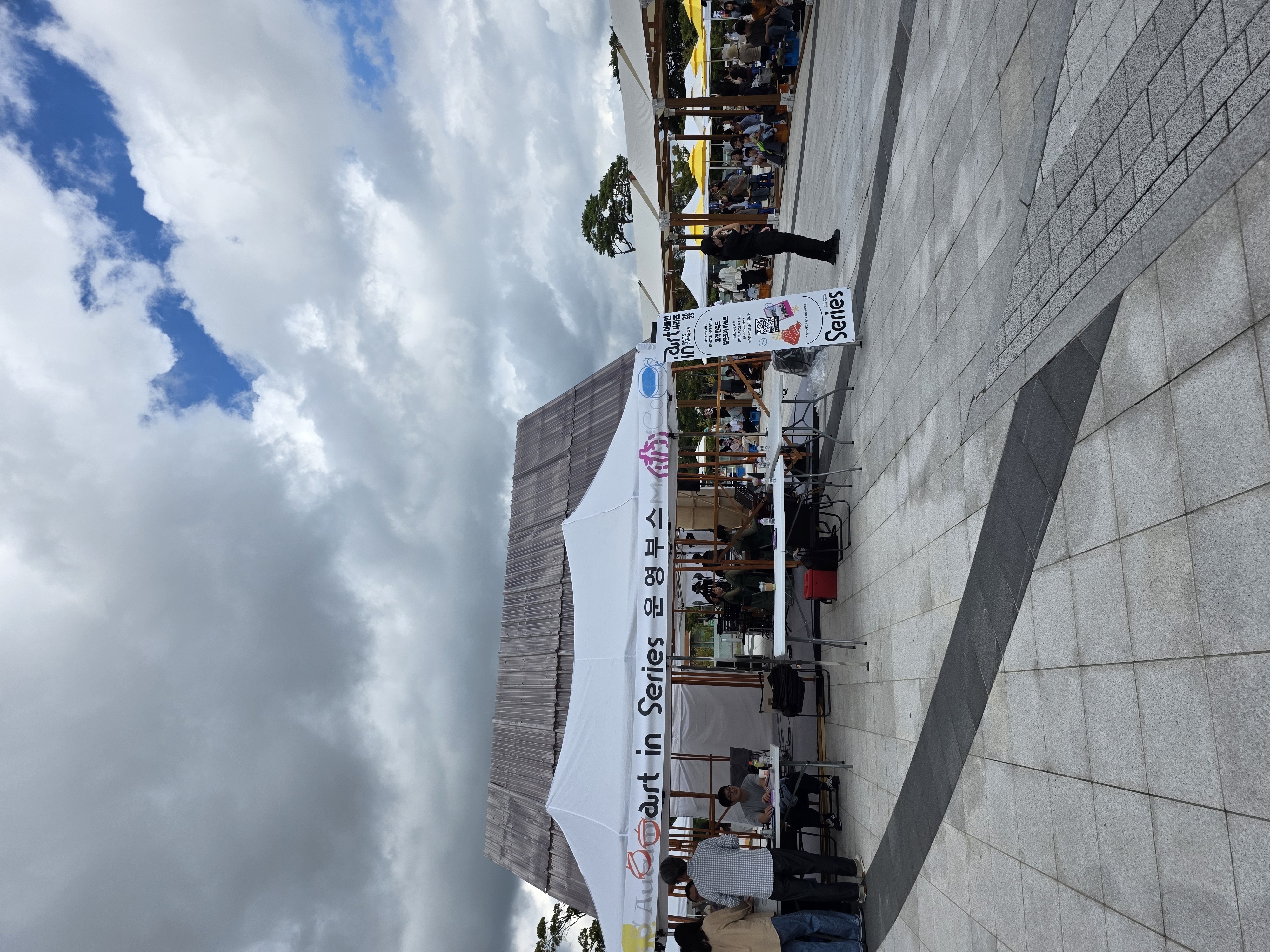 이날 저는 모든 공연을 관람하지는 못하였지만, 퓨전 국악팀인 **가야금 팀 '오드리'**의 무대를 잠시나마 감상할 수 있었습니다. 집중하여 처음부터 끝까지 앉아서 음악을 듣지는 못하였지만, 은은하게 광장에 퍼지는 가야금 선율은 그 자체로 공간에 우아한 활력을 불어넣어 주었습니다. 전통 악기의 아름다운 소리가 현대적인 감각과 어우러져 관객들에게 편안하면서도 깊이 있는 울림을 선사하였습니다. 다음번에는 시간을 잘 조절하여, 공연이 시작되는 순간부터 끝날 때까지 온전히 몰입해보고 싶다는 생각이 들었습니다. 국립극장의 전속 단체나 청년 예술가들이 꾸미는 무대가 많다고 하니, 다른 장르의 공연도 기회가 된다면 꼭 관람해보고 싶었습니다.